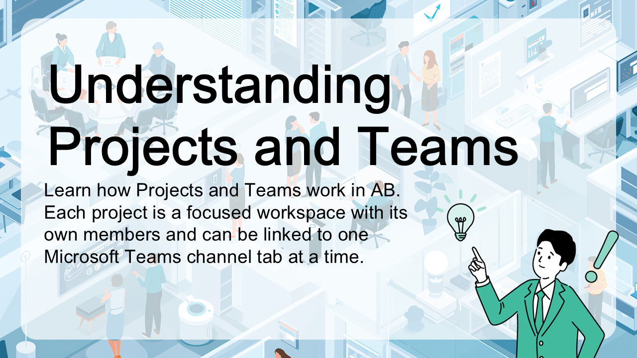 Learn how Projects and Teams work in AB. Each project is a focused workspace with its own members and can be linked to one Microsoft Teams channel tab at a time.