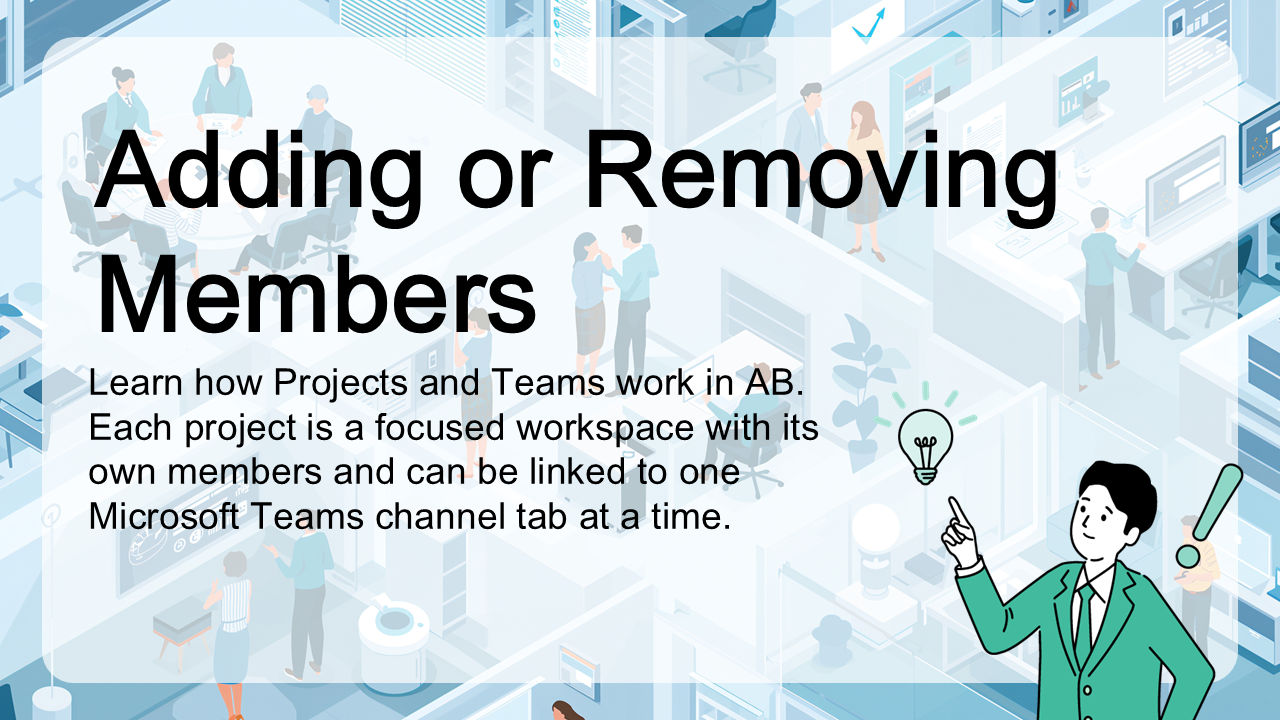 Learn how to add or remove members in an AB project. Users can join automatically if they are part of the connected Teams channel. Manual role assignment and license-based access are also supported.