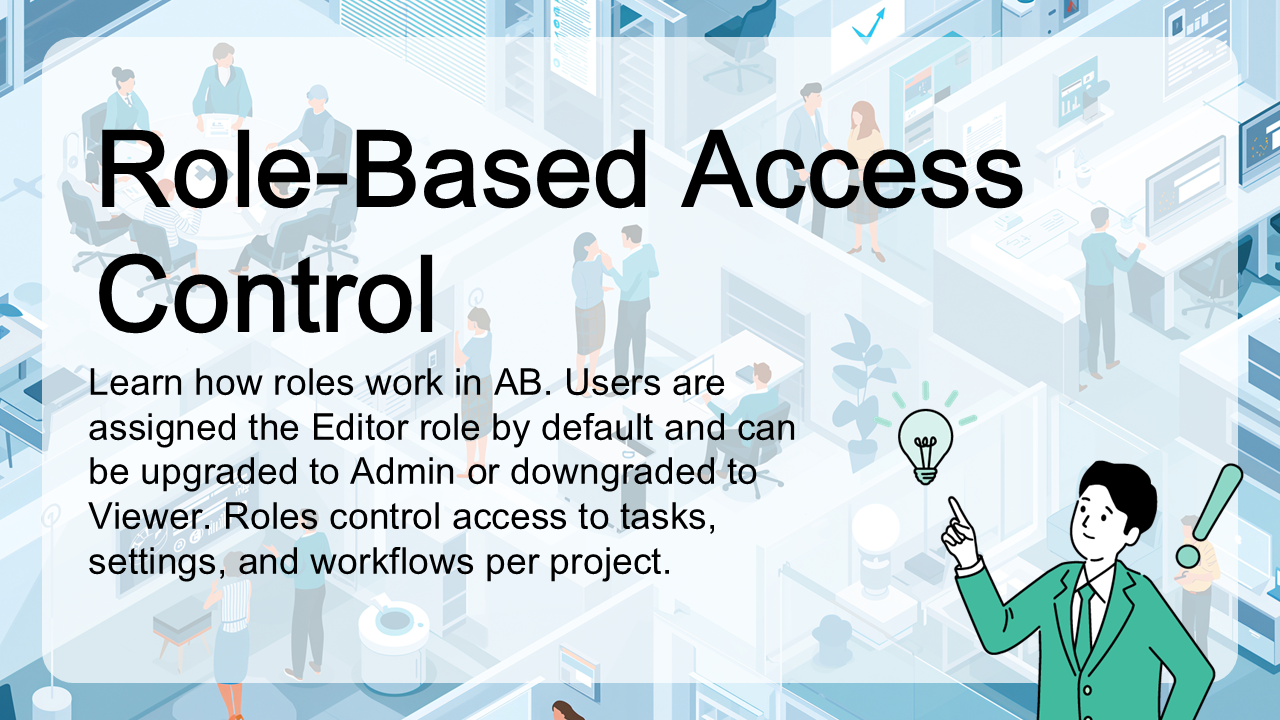 Learn how roles work in AB. Users are assigned the Editor role by default and can be upgraded to Admin or downgraded to Viewer. Roles control access to tasks, settings, and workflows per project.